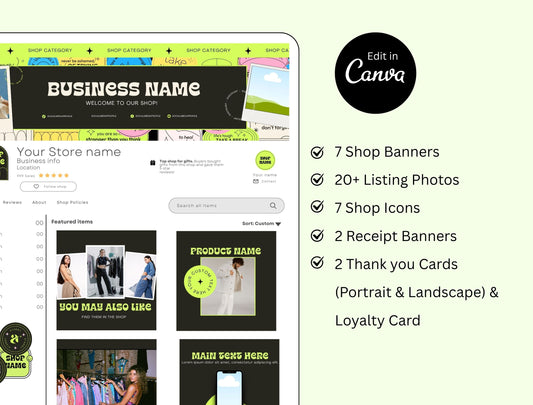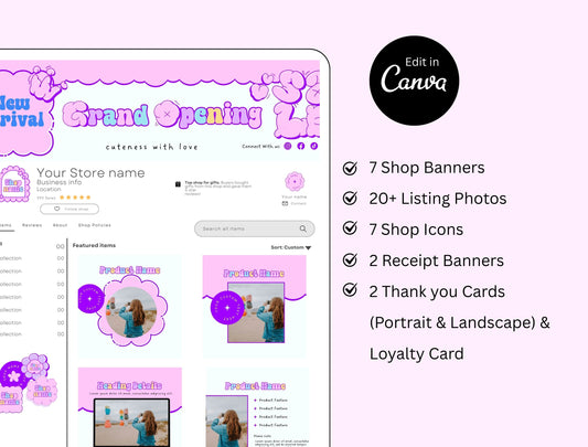 Etsy Shop Kit Pinkvibe Bundle, Editable Canva Templates, Product Listing Photos Mockup, Etsy Seller Retro Drawn Store Branding