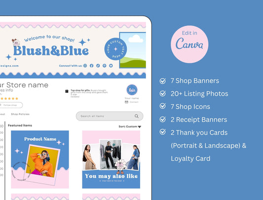 Etsy Shop Kit Blush&Blue Bundle, Editable Canva Templates, Product Listing Photos Mockup, Etsy Seller Store Branding