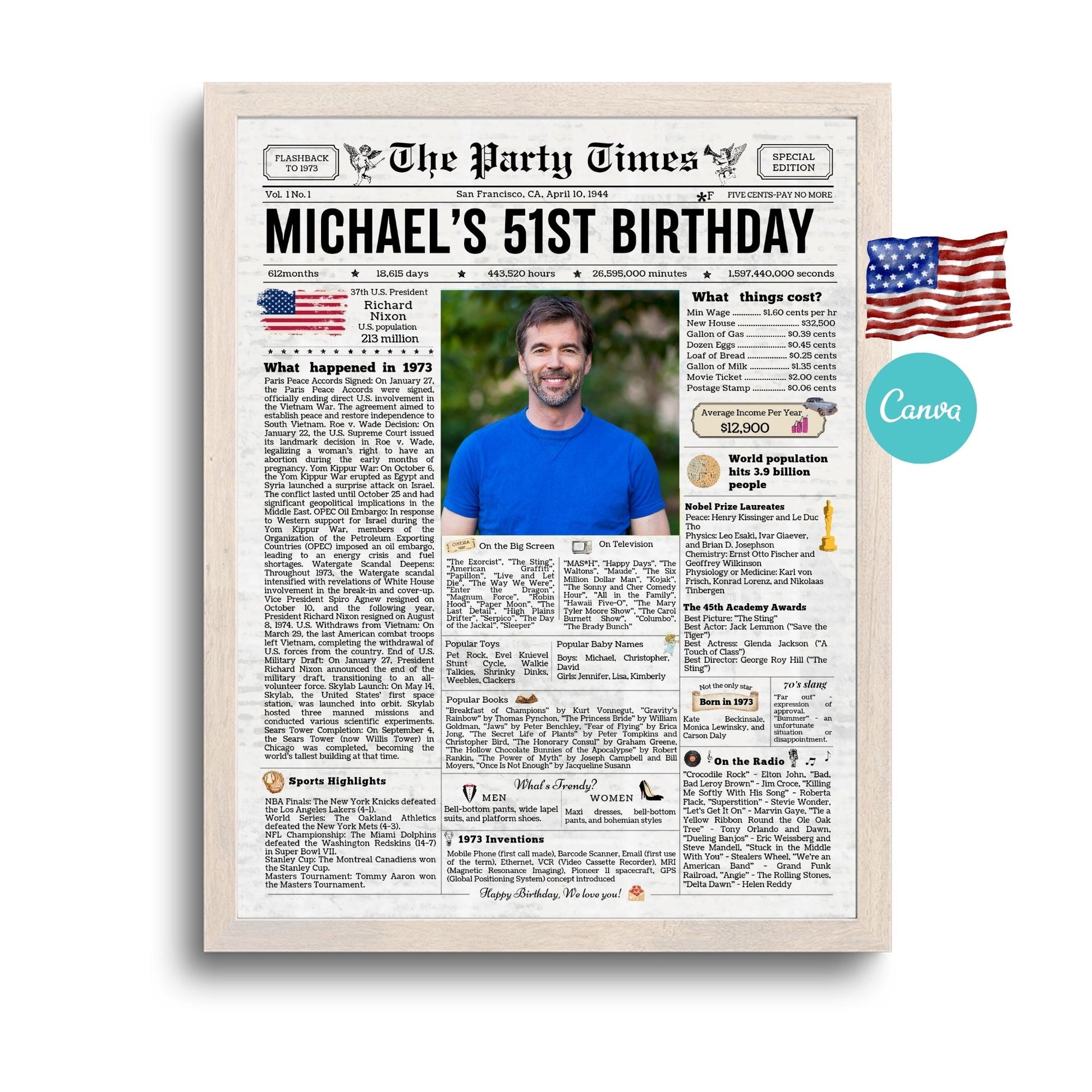 Transform any special occasion into an extraordinary celebration with our Birthday Newspaper Template, available on Canva. Personalized Newspaper Birthday gift (US version) - A digital birthday poster with news, events and highlights from the past, finished as a REALISTIC, AGED, Colored newspaper.