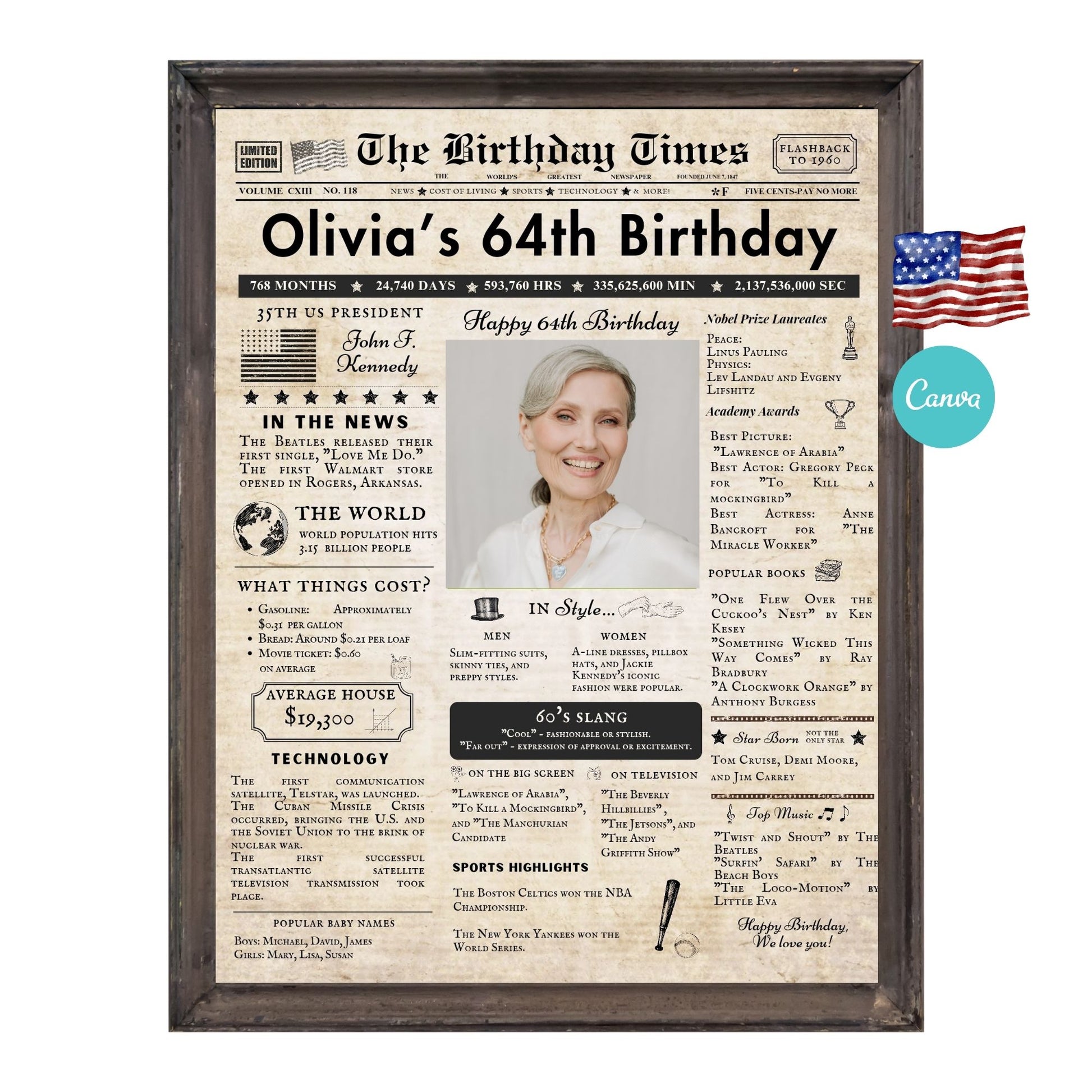 64th Birthday Vintage Brown Newspaper, EDITABLE Birthday Posters, Printable Newspaper Birthday Gifts, Canva