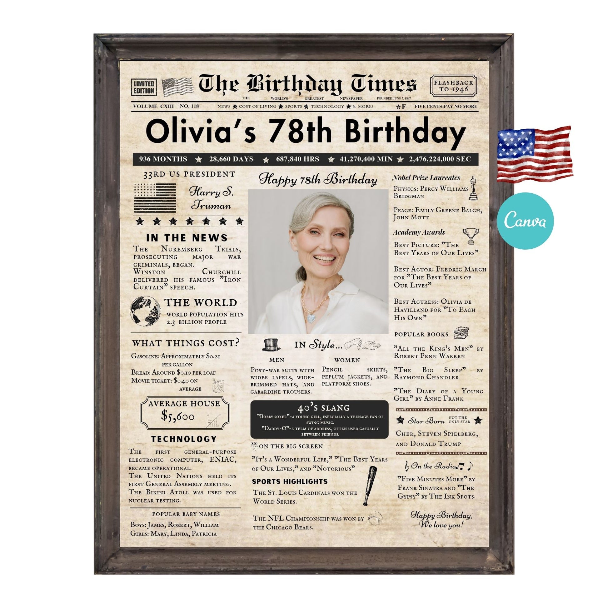 78th Birthday Vintage Brown Newspaper, EDITABLE Birthday Posters, Printable Newspaper Birthday Gifts, Canva