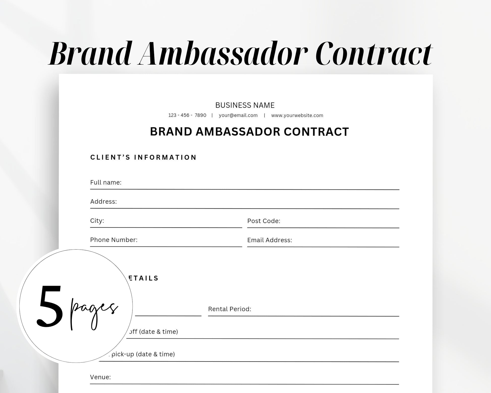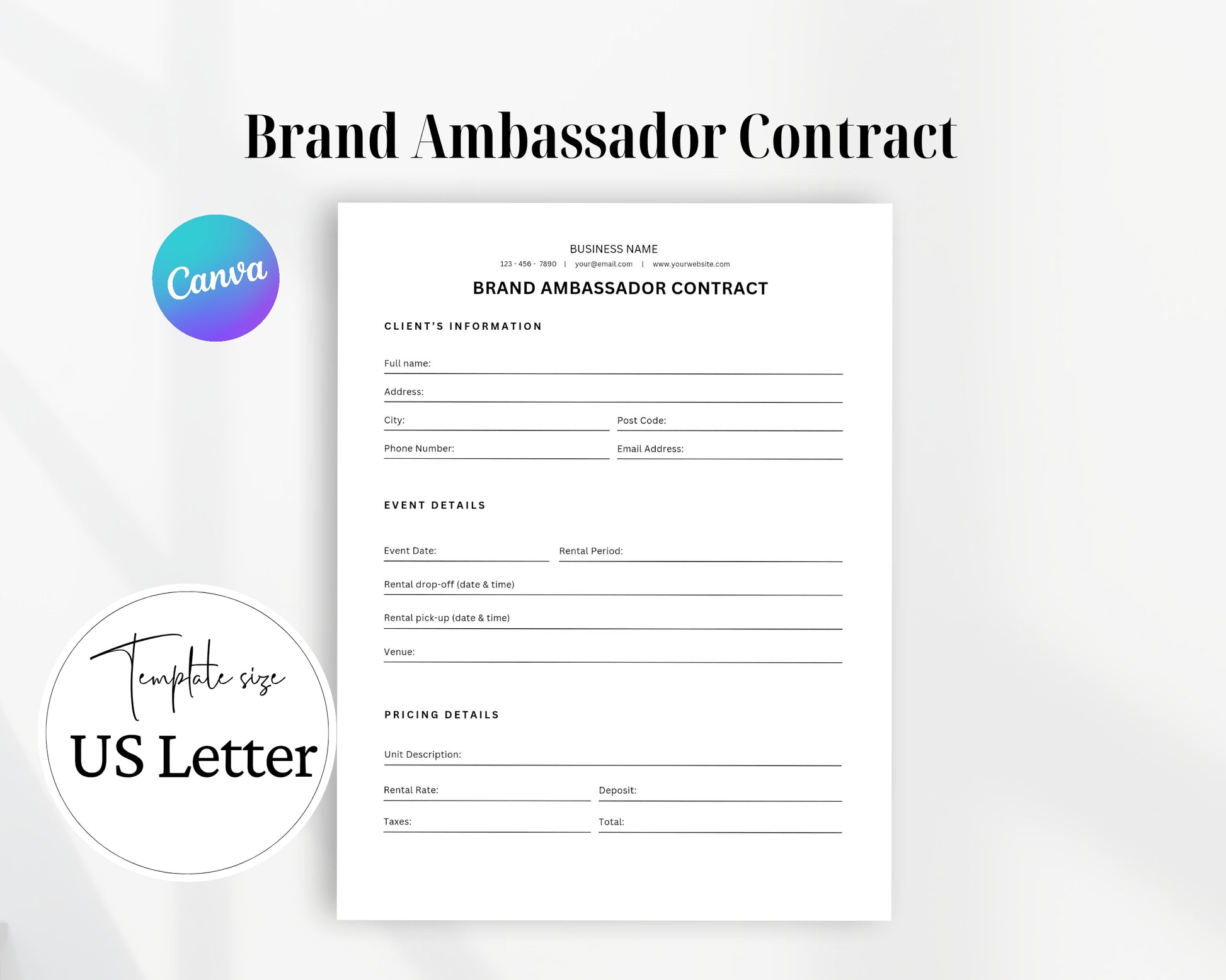 Brand Ambassador Contract Printable Form, Edit in Canva, Digital