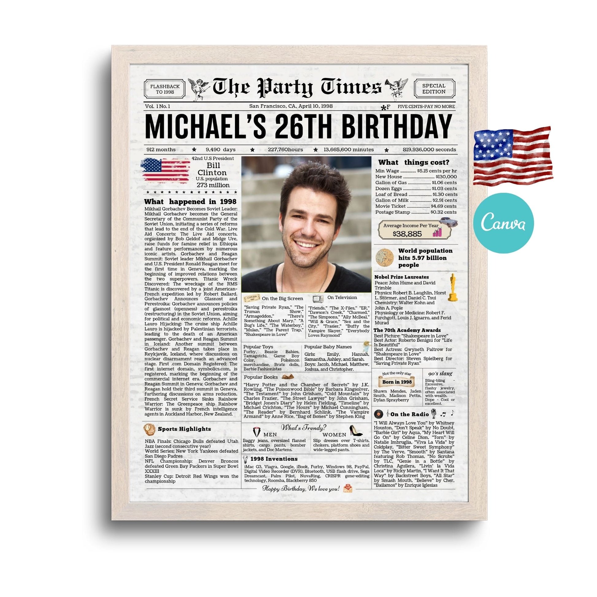 26th Birthday Vintage Newspaper, EDITABLE Birthday Posters, Printable Newspaper Birthday Gifts, Canva