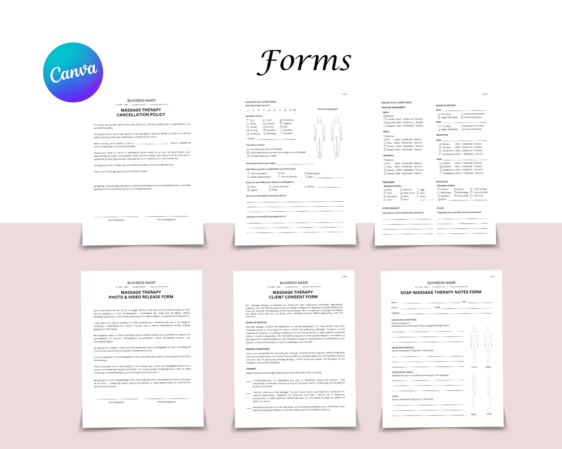 Massage Therapy Form, Consultation form, Client consent form, Loyalty Card, Business Card, Editable Canva templates, Aftercare Card