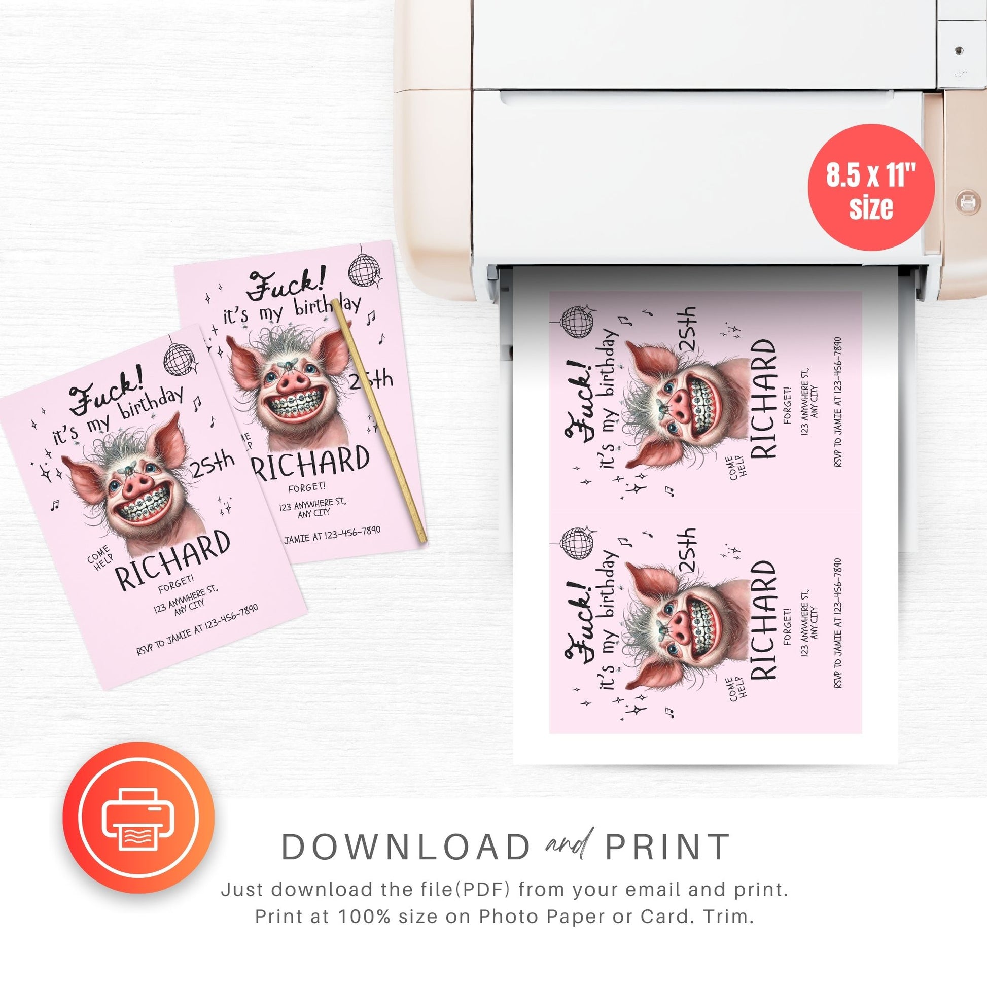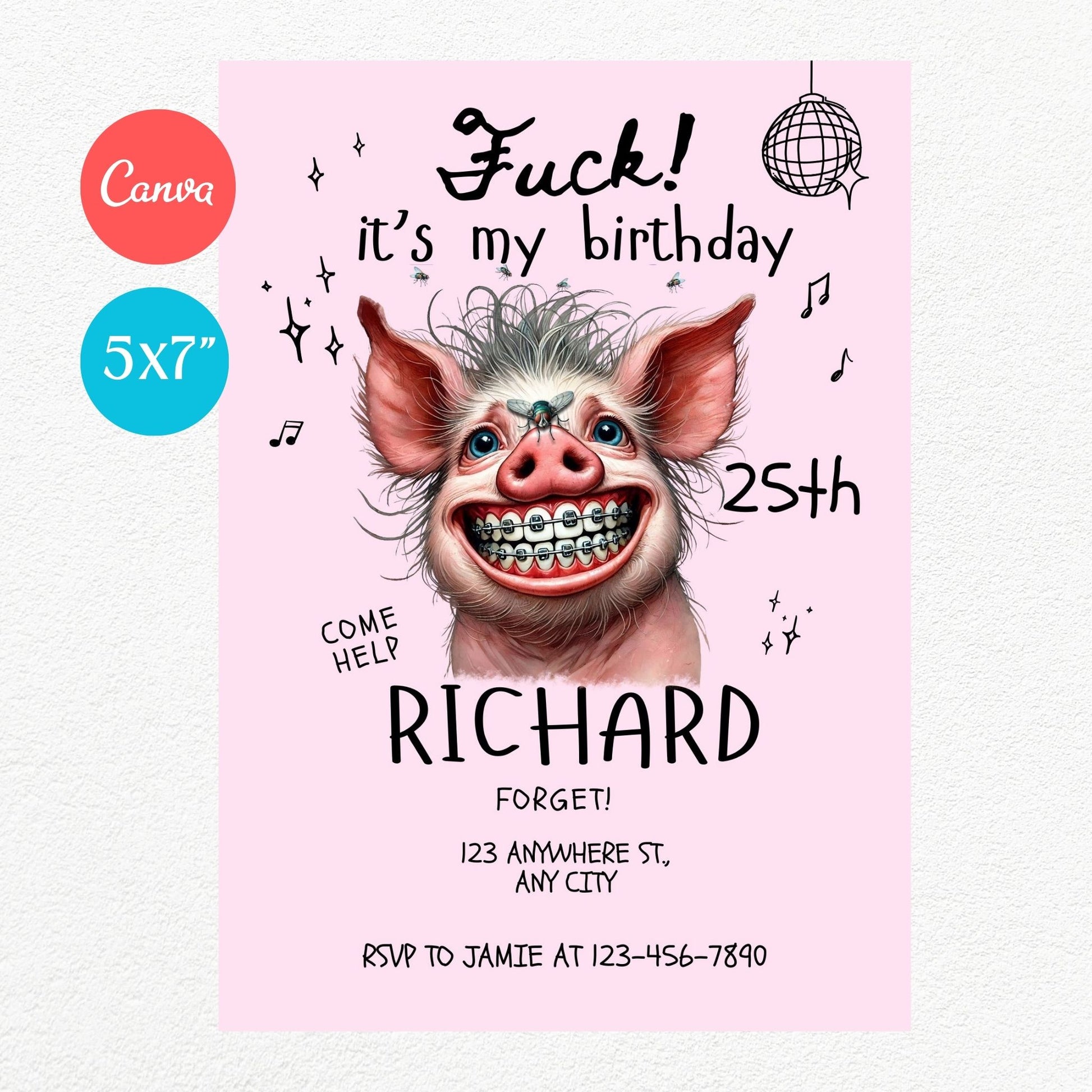 Pink Pig Funny Birthday Party Invitation