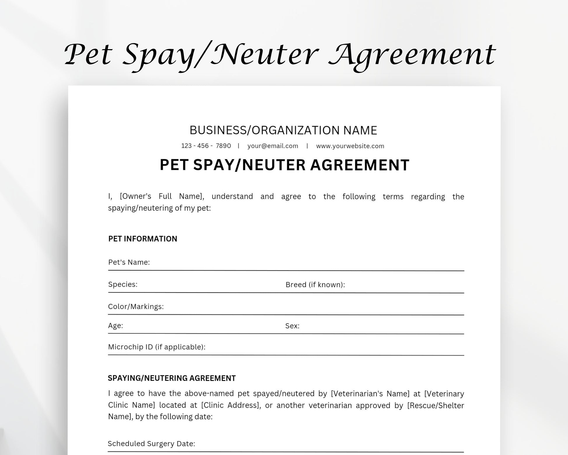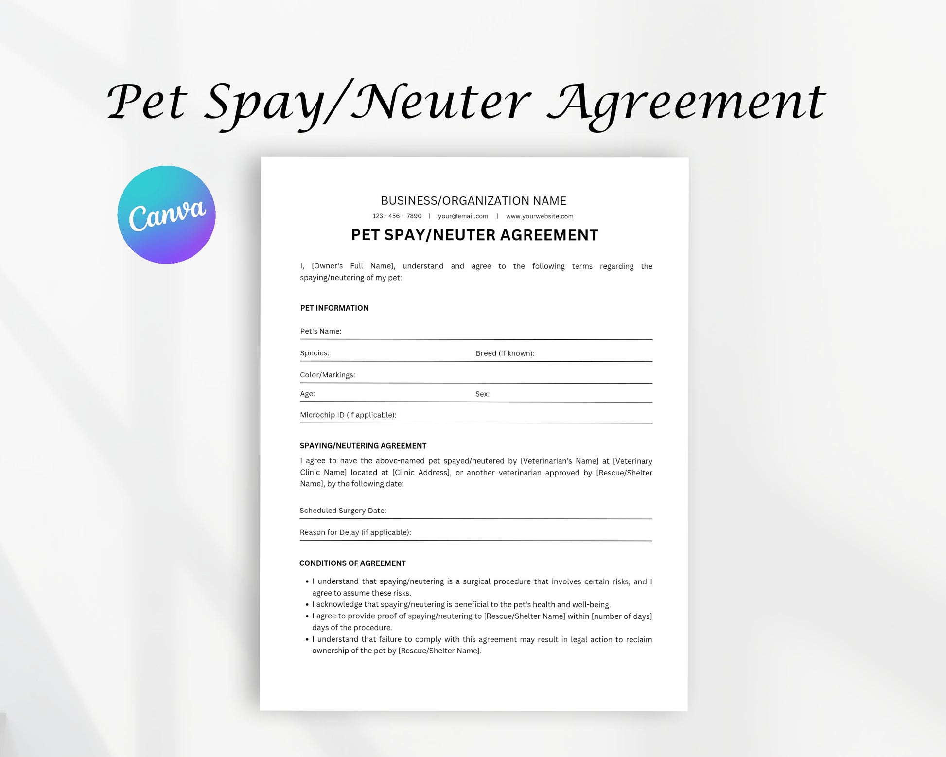 Pet Spay or Pet Neuter Agreement Printable Form, Edit in Canva, Digital
