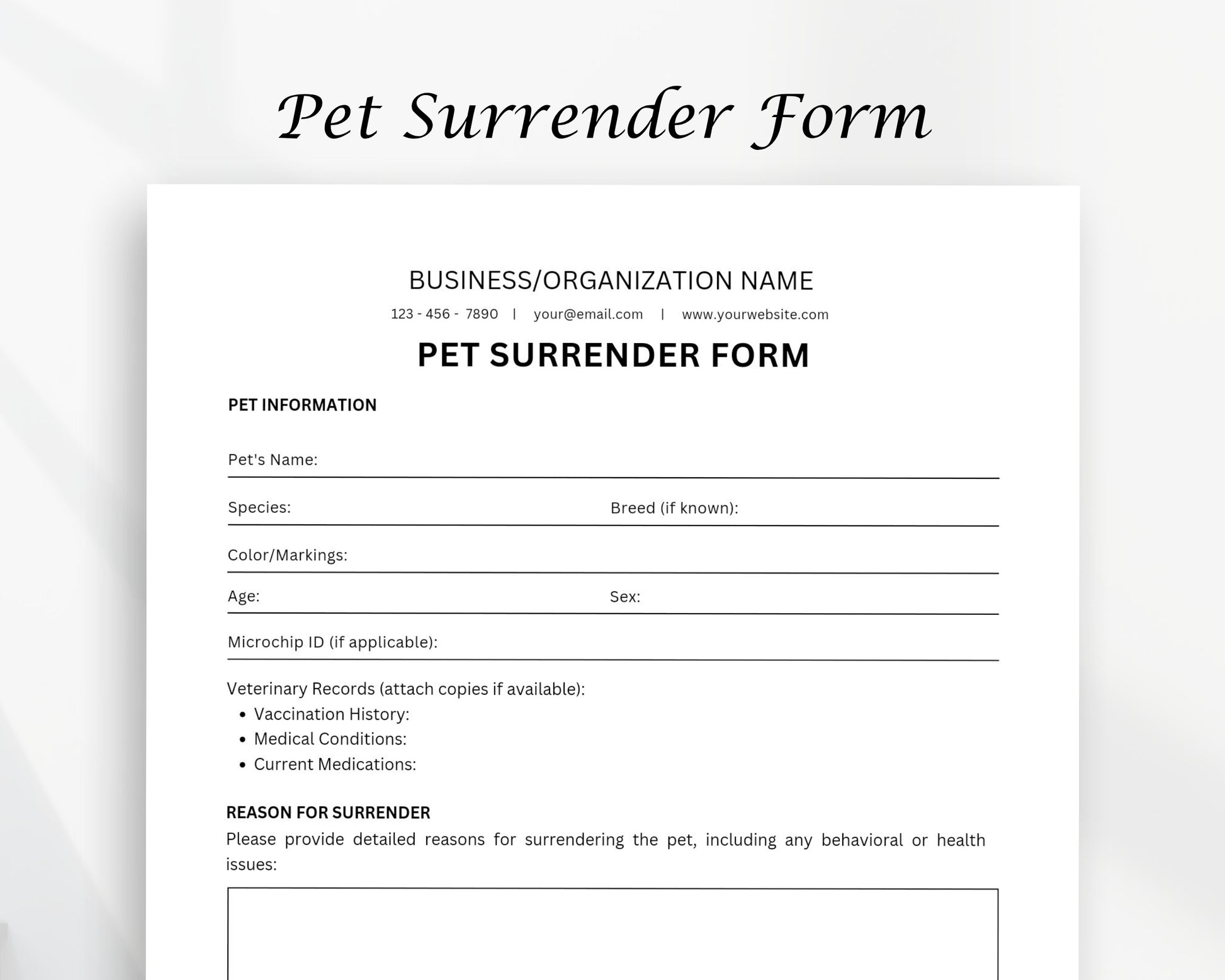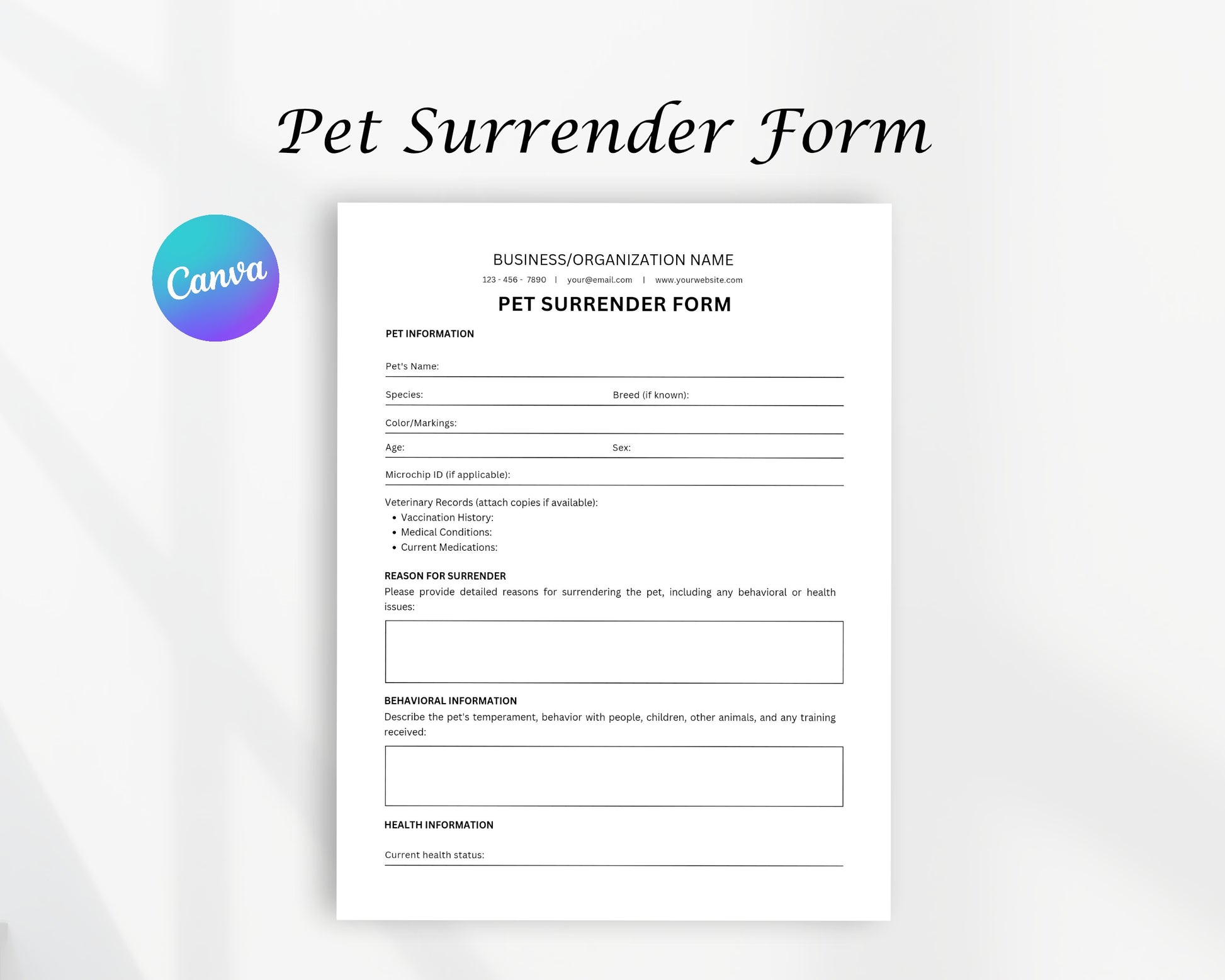 Pet Surrender Printable Form, Edit in Canva, Digital