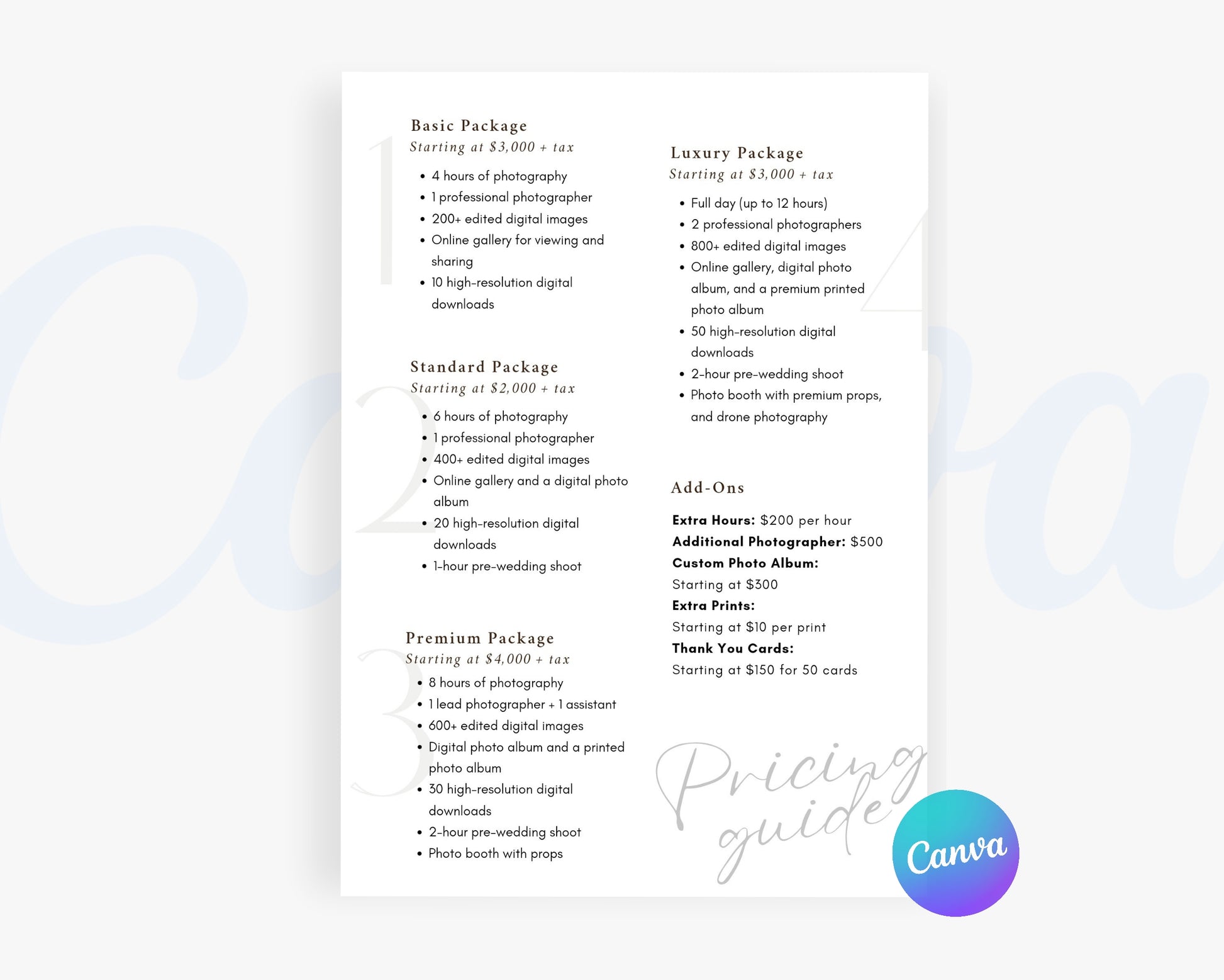 Photography Pricing Guide, Wedding Photography Price List, Edit in Canva - PDP07