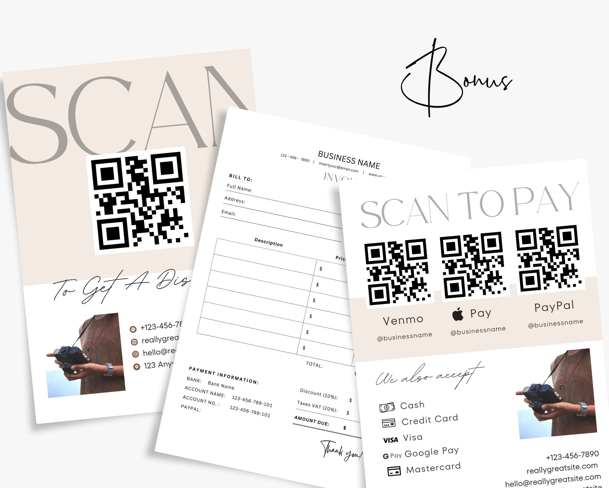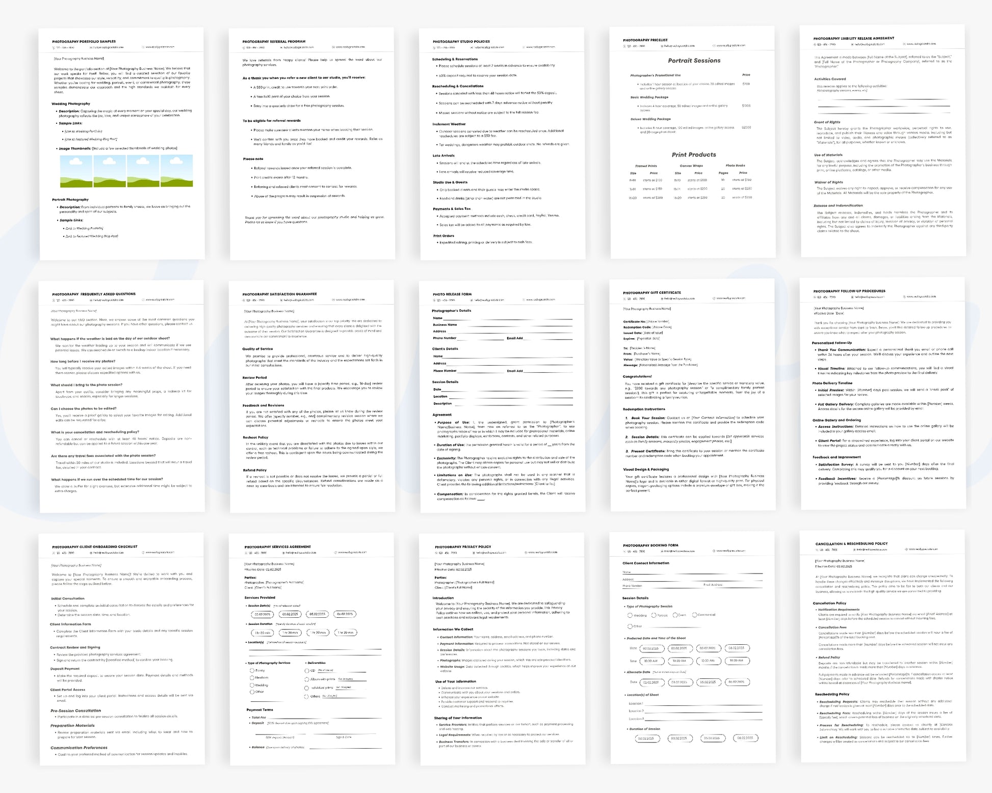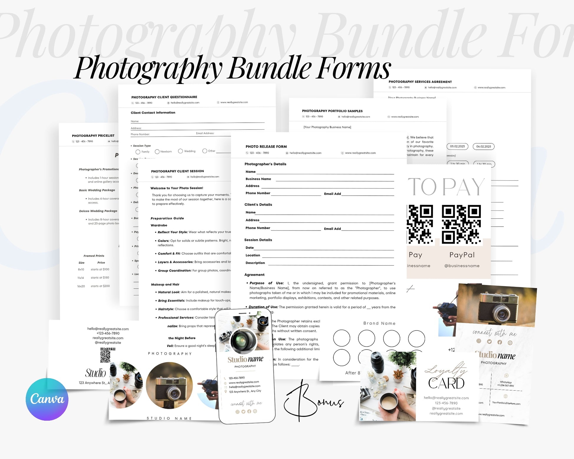 The Essential Photography Bundle offers contract templates for photographers, including model releases, print releases, and other crucial documents to safeguard your business. Effortlessly market your photography business with our professionally designed, pre-made business essentials. Just drag and drop your images into the placeholders, customize the text, and then email or print your materials! All text is provided but fully editable. All you need is a free Canva account to edit directly in your browser.