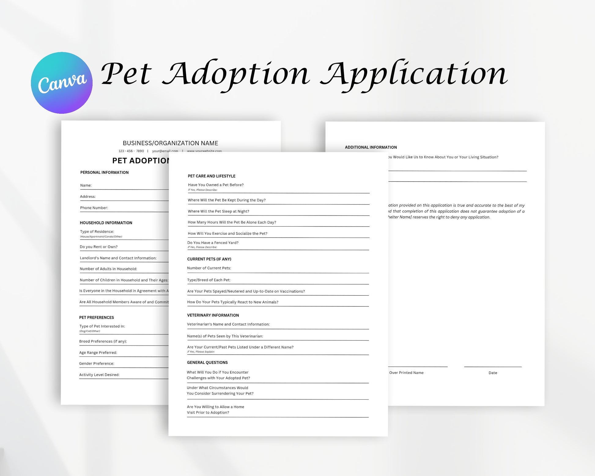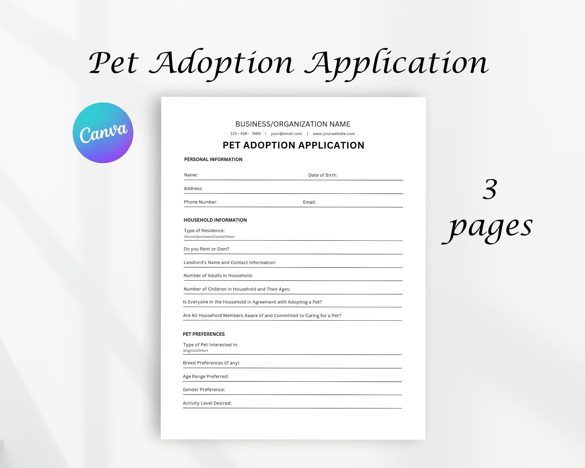 Pet Adoption Application Printable Form, Edit in Canva, Digital