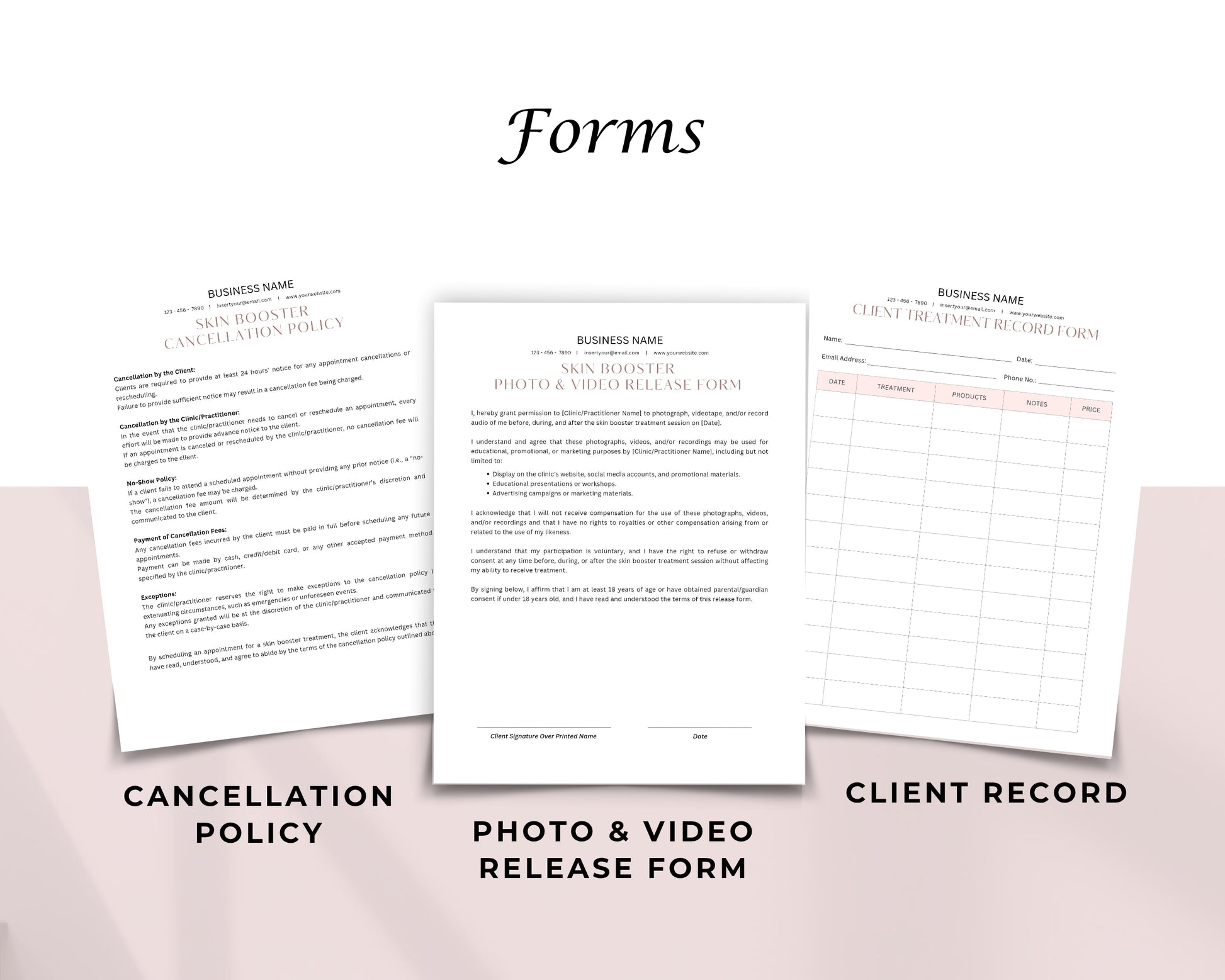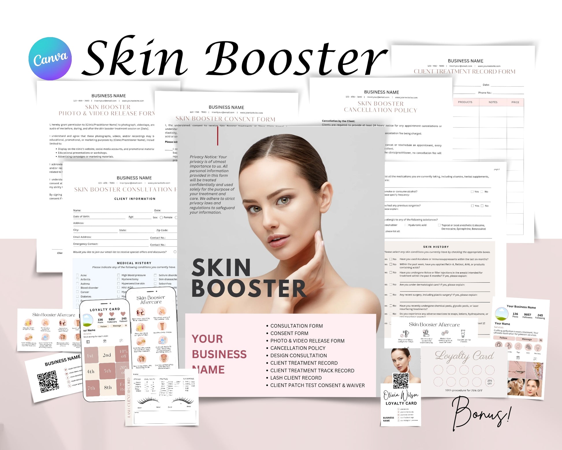 Skin Booster Form, Consultation form, Client consent form, Loyalty Card, Business Card, Editable Canva templates, Aftercare Card