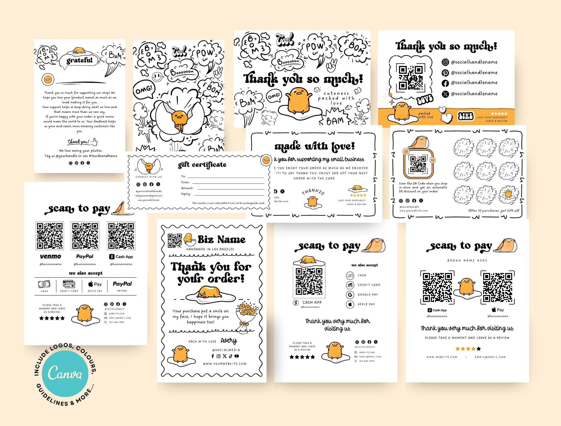 Small Business Printable Canva Templates – Thank You & Loyalty Card, Gift Certificate, QR Code Payment Gudetama Playful Fun Theme