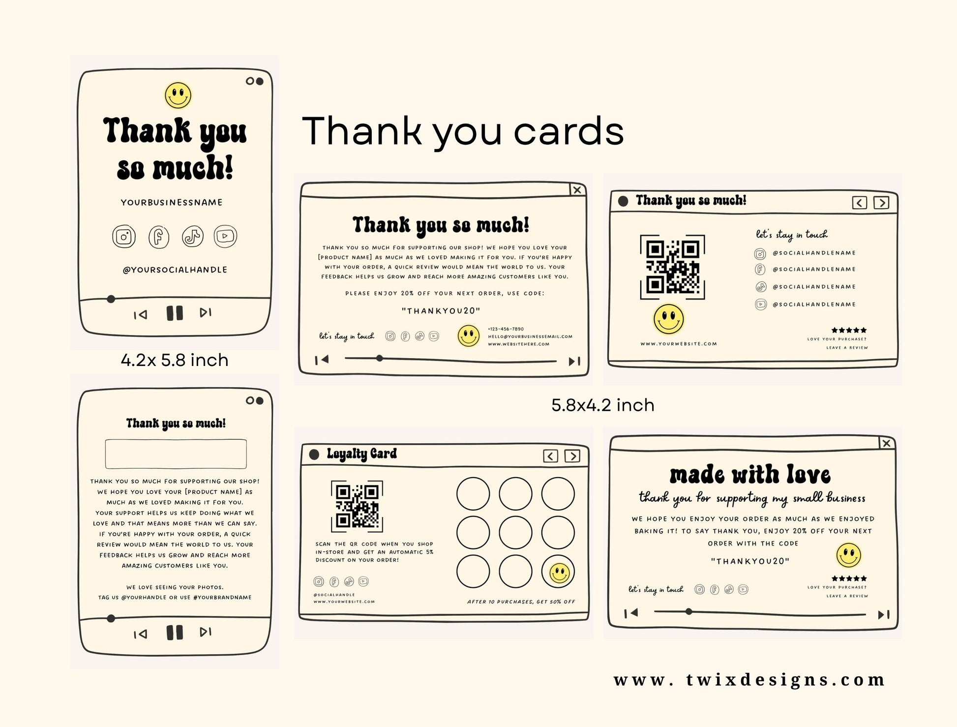 Small Business Printable Kit Canva Templates – Thank You Card, Loyalty Card, Gift Certificate, QR Code Payment Retroframe Theme