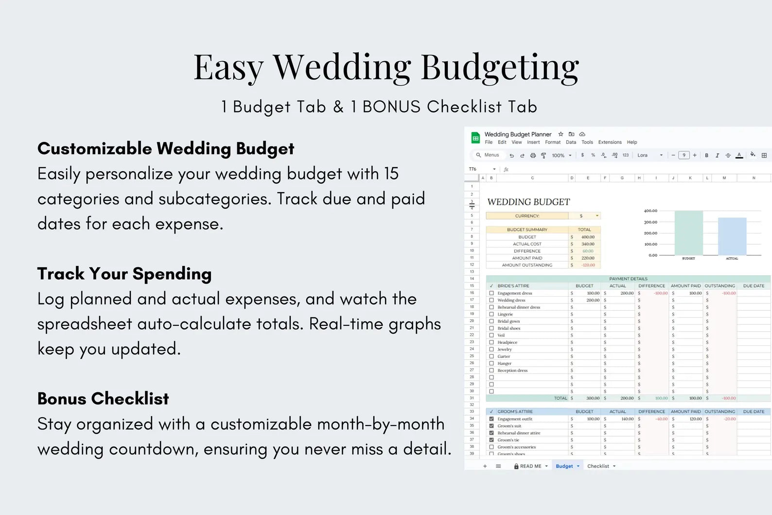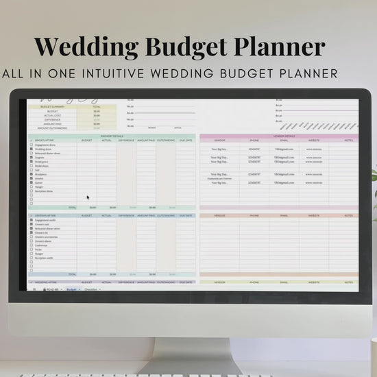 Plan and manage your wedding with ease using our Wedding Budget Planner Spreadsheet! This easy-to-use template allows you to track your wedding budget, actual expenses, and ensure everything stays on track for your big day. All calculations are done for you, and the layout is simple and intuitive. Plus, the customizable sub-categories let you tailor it to your needs!